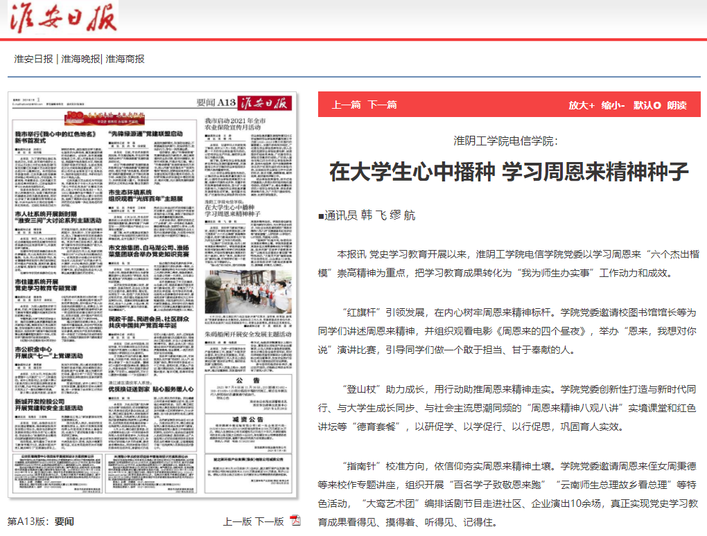 本报讯 党史学习教育开展以来,淮阴工学院电信学院党委以学习周恩来“六个杰出楷模”崇高精神为重点,把学习教育成果转化为“我为师生办实事”工作动力和成效。
