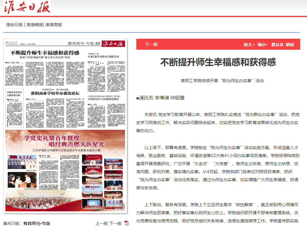 本报讯 党史学习教育开展以来,淮阴工学院扎实推进“我为群众办实事”活动,把党史学习同推动工作、解决实际问题结合起来,切实把党史学习教育成果转化成为师生办实事的动力。
