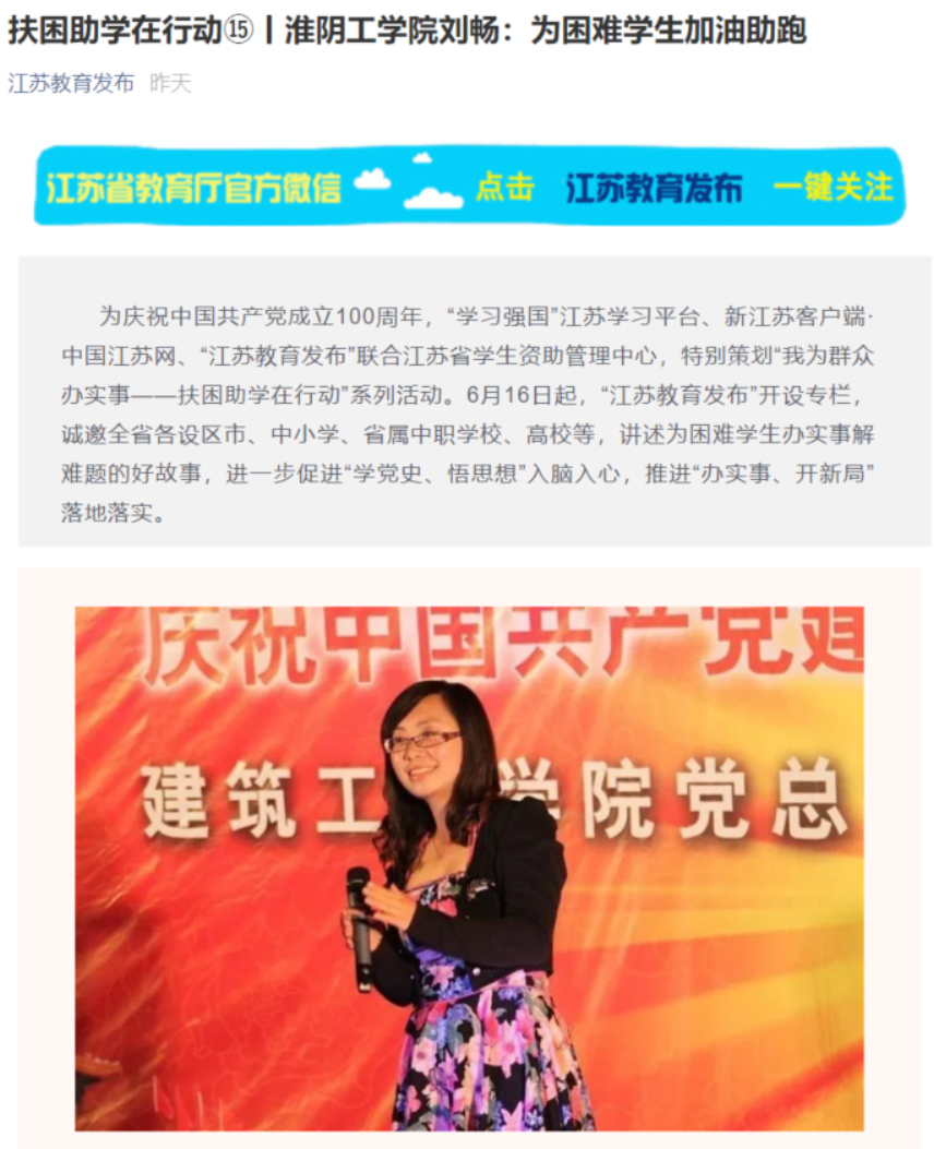 淮阴工学院学生资助管理中心肩负全校2万余名学生的“奖、助、贷、勤、补、免”等工作,为进一步做好党史学习教育,把“我为群众办实事”实践活动落到实处,刘畅老师想学生所想,解学生所需。她积极创新资助工作理念,改进资助工作方法,在实践中总结出“四心四畅”资助育人工作法,通过开展特色活动,打造资助品牌,传递爱的温度。