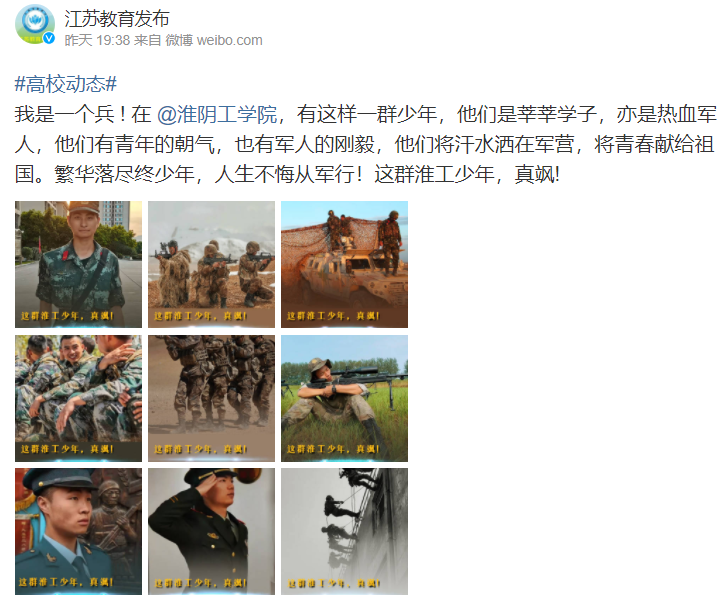 我是一个兵!在淮阴工学院,有这样一群少年,他们是莘莘学子,亦是热血军人,他们有青年的朝气,也有军人的刚毅,他们将汗水洒在军营,将青春献给祖国。繁华落尽终少年,人生不悔从军行!这群淮工少年,真飒!