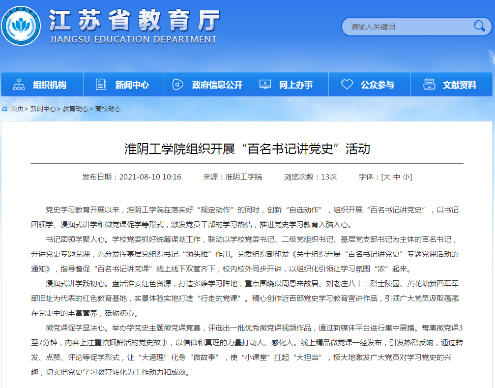 党史学习教育开展以来,淮阴工学院在落实好“规定动作”的同时,创新“自选动作”,组织开展“百名书记讲党史”,以书记团领学、浸润式讲学和微党课促学等形式,激发党员干部的学习热情,推进党史学习教育入脑入心。