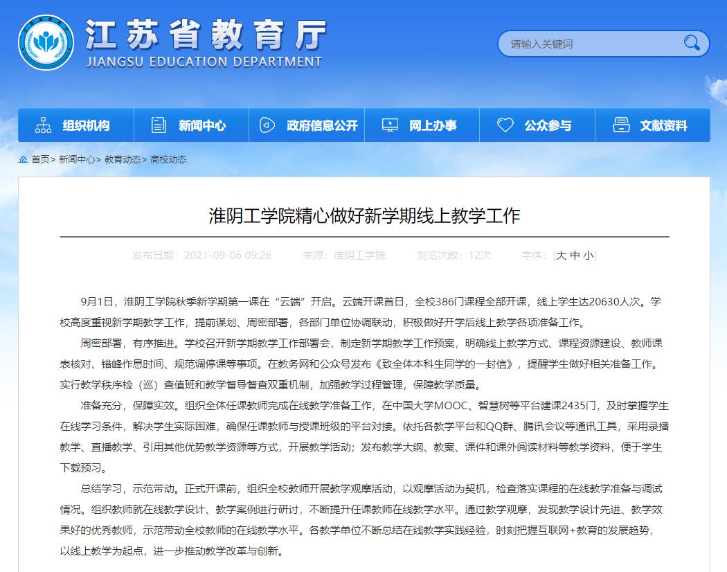 9月1日,淮阴工学院秋季新学期第一课在“云端”开启。云端开课首日,全校386门课程全部开课,线上学生达20630人次。学校高度重视新学期教学工作,提前谋划、周密部署,各部门单位协调联动,积极做好开学后线上教学各项准备工作。