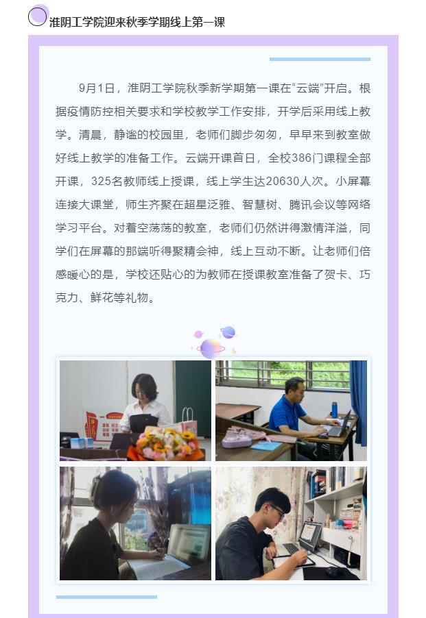 9月1日,淮阴工学院秋季新学期第一课在“云端”开启。根据疫情防控相关要求和学校教学工作安排,开学后采用线上教学。清晨,静谧的校园里,老师们脚步匆匆,早早来到教室做好线上教学的准备工作。云端开课首日,全校386门课程全部开课,325名教师线上授课,线上学生达20630人次。小屏幕连接大课堂,师生齐聚在超星泛雅、智慧树、腾讯会议等网络学习平台。对着空荡荡的教室,老师们仍然讲得激情洋溢,同学们在屏幕的那端听得聚精会神,线上互动不断。让老师们倍感暖心的是,学校还贴心的为教师在授课教室准备了贺卡、巧克力、鲜花等礼物。