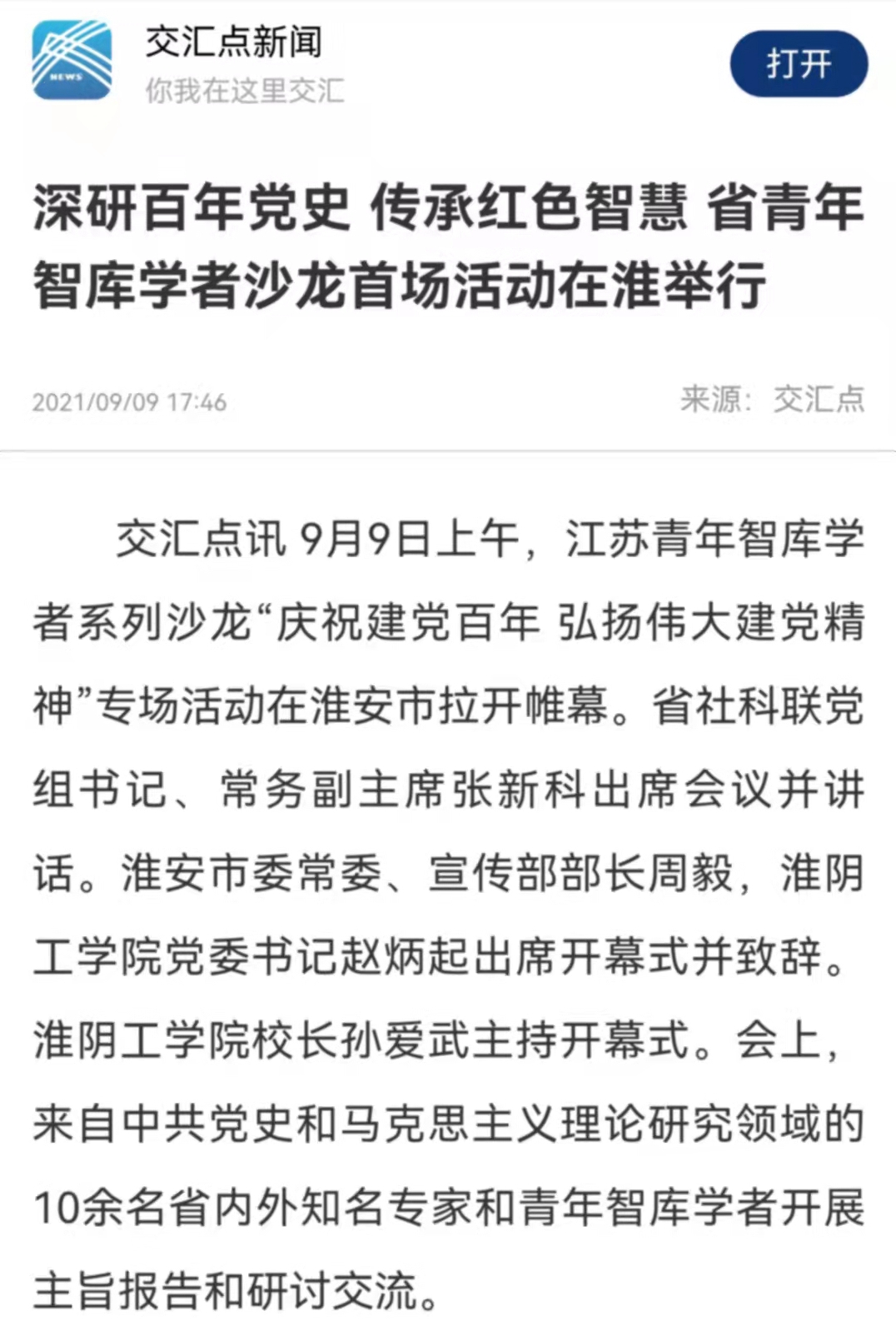 交汇点讯 9月9日上午,江苏青年智库学者系列沙龙“庆祝建党百年 弘扬伟大建党精神”专场活动在淮安市拉开帷幕。省社科联党组书记、常务副主席张新科出席会议并讲话。淮安市委常委、宣传部部长周毅,淮阴工学院党委书记赵炳起出席开幕式并致辞。淮阴工学院校长孙爱武主持开幕式。会上,来自中共党史和马克思主义理论研究领域的10余名省内外知名专家和青年智库学者开展主旨报告和研讨交流。