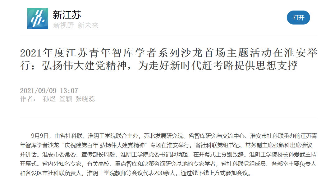 9月9日,由省社科联、淮阴工学院联合主办,苏北发展研究院、省智库研究与交流中心、淮安市社科联承办的江苏青年智库学者沙龙“庆祝建党百年 弘扬伟大建党精神”专场在淮安举行。省社科联党组书记、常务副主席张新科出席会议并讲话。淮安市委常委、宣传部长周毅,淮阴工学院党委书记赵炳起,在开幕式上分别致辞。淮阴工学院校长孙爱武主持开幕式。省内外知名专家,有关高校、重点智库和决策咨询研究基地的专家学者,省社科联党组成员、各部室主要负责人和各设区市社科联负责人,淮阴工学院教师等会议代表200余人,通过线下线上方式参加会议。