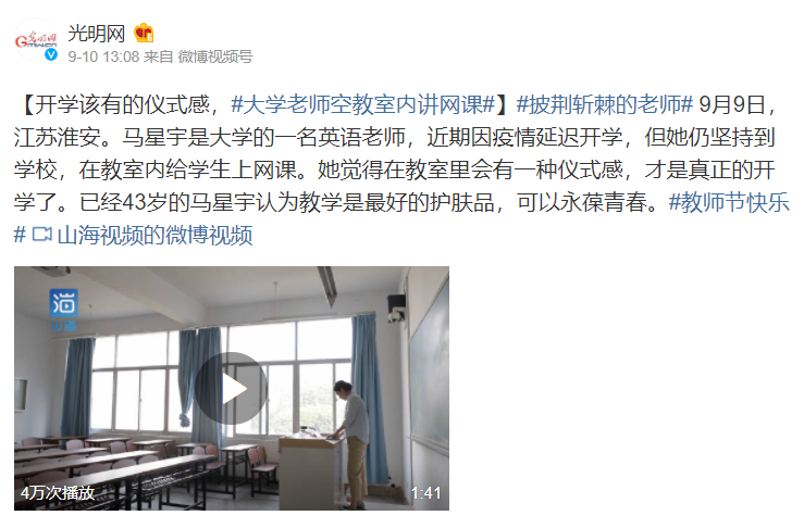 9月9日,江苏淮安。马星宇是大学的一名英语老师,近期因疫情延迟开学,但她仍坚持到学校,在教室内给学生上网课。她觉得在教室里会有一种仪式感,才是真正的开学了。已经43岁的马星宇认为教学是最好的护肤品,可以永葆青春。