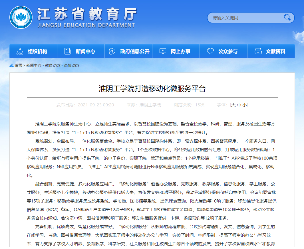 淮阴工学院以服务师生为中心,立足师生实际需求,以智慧校园建设为基础,整合全校教学、科研、管理、服务及校园生活等方面业务流程,深度打造“1+1+1+N移动化微服务”平台,有力促进学校服务水平的进一步提升。