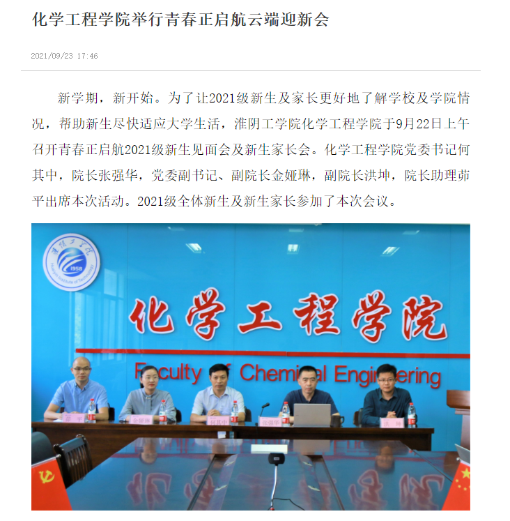 新学期,新开始。为了让2021级新生及家长更好地了解学校及学院情况,帮助新生尽快适应大学生活,淮阴工学院化学工程学院于9月22日上午召开青春正启航2021级新生见面会及新生家长会。化学工程学院党委书记何其中,院长张强华,党委副书记、副院长金娅琳,副院长洪坤,院长助理茆平出席本次活动。2021级全体新生及新生家长参加了本次会议。