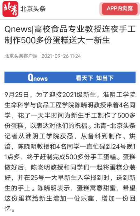 2021级新生,淮阴工学院生命科学与食品工程学院陈晓明教授带着4名同学,花了一天半时间为新生手工制作了500多份蛋糕,以表达对他们的祝福。北青-北京头条记者从淮阴工学院获悉,从备料到制作、烘焙,陈晓明教授和4名同学一直忙碌到24号晚11点多,终于赶制完成500多份手工蛋糕。蛋糕做好后,陈晓明教授和同学们一起将蛋糕分装好,并在25号一大早新生入学报到时,送到新生的手上。陈晓明表示,蛋糕寓意甜蜜,希望这份蛋糕给新生增加一份乐趣,增加一份回忆。