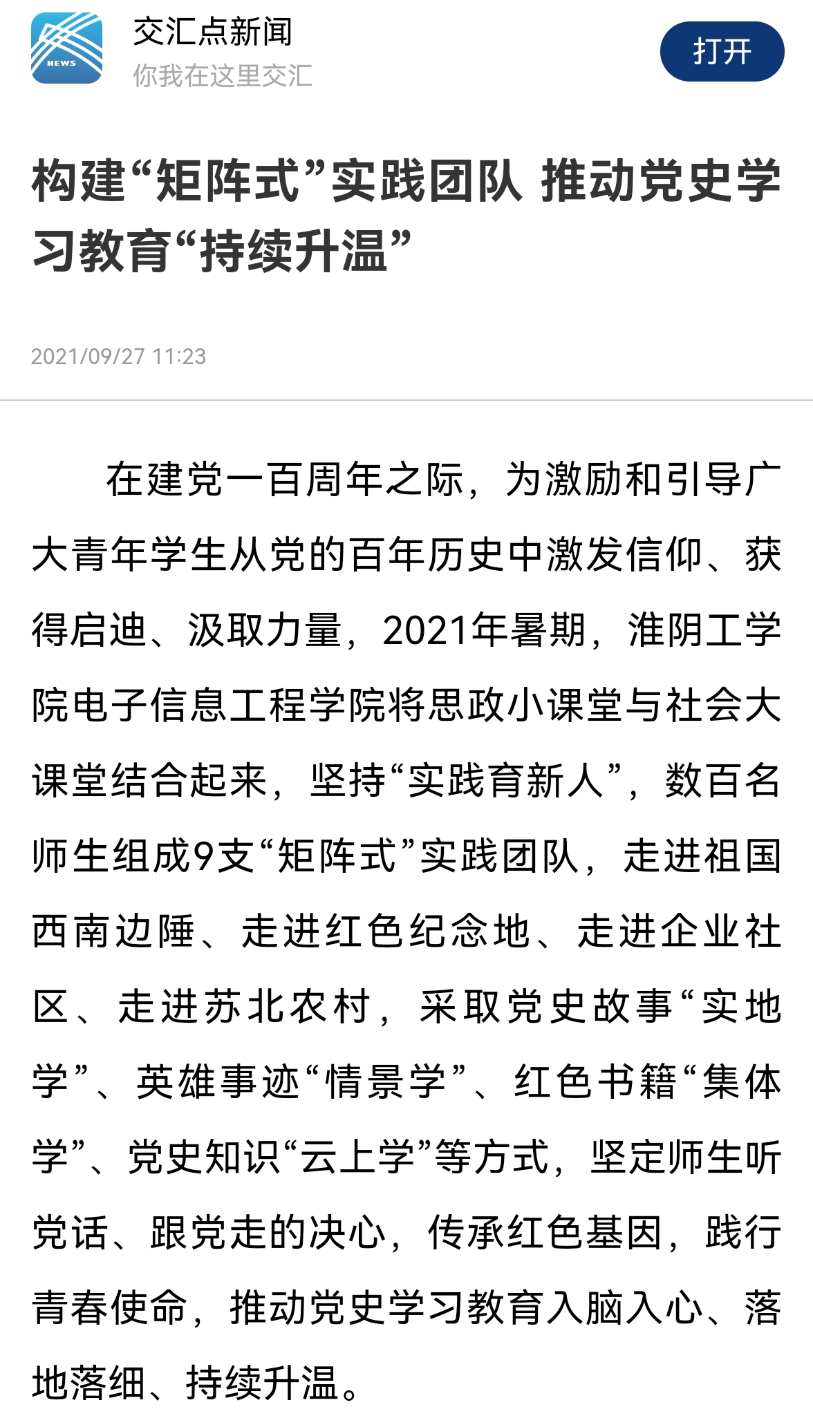 在建党一百周年之际,为激励和引导广大青年学生从党的百年历史中激发信仰、获得启迪、汲取力量,2021年暑期,淮阴工学院电子信息工程学院将思政小课堂与社会大课堂结合起来,坚持“实践育新人”,数百名师生组成9支“矩阵式”实践团队,走进祖国西南边陲、走进红色纪念地、走进企业社区、走进苏北农村,采取党史故事“实地学”、英雄事迹“情景学”、红色书籍“集体学”、党史知识“云上学”等方式,坚定师生听党话、跟党走的决心,传承红色基因,践行青春使命,推动党史学习教育入脑入心、落地落细、持续升温。