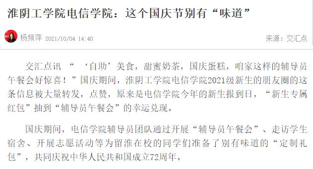 交汇点讯 “ ‘自助’美食,甜蜜奶茶,国庆蛋糕,咱家这样的辅导员午餐会好惊喜!”国庆期间,淮阴工学院电信学院2021级新生的朋友圈的这条信息被大量转发,点赞,原来是电信学院今年的新生报到日,“新生专属红包”抽到“辅导员午餐会”的幸运兑现。
