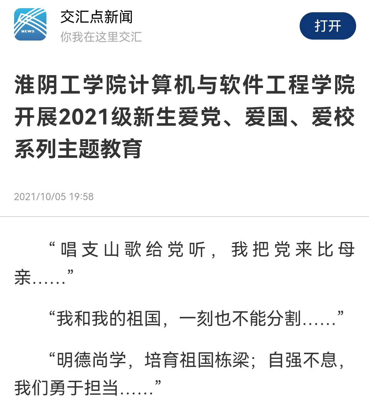 伴随着嘹亮的歌声,淮阴工学院计算机与软件工程学院2021级新生爱党爱国爱校系列教育活动拉开帷幕,深情优美的歌声在校园上空飘荡,爱党爱国爱校之情在每个新生心中流淌。学院先后组织开展了主题讲座、红色经典品读会、网上追寻红色足迹等爱党爱国爱校主题教育活动,加强新生思想政治引领,激发爱党爱国爱校热情,强化主动担当使命意识。