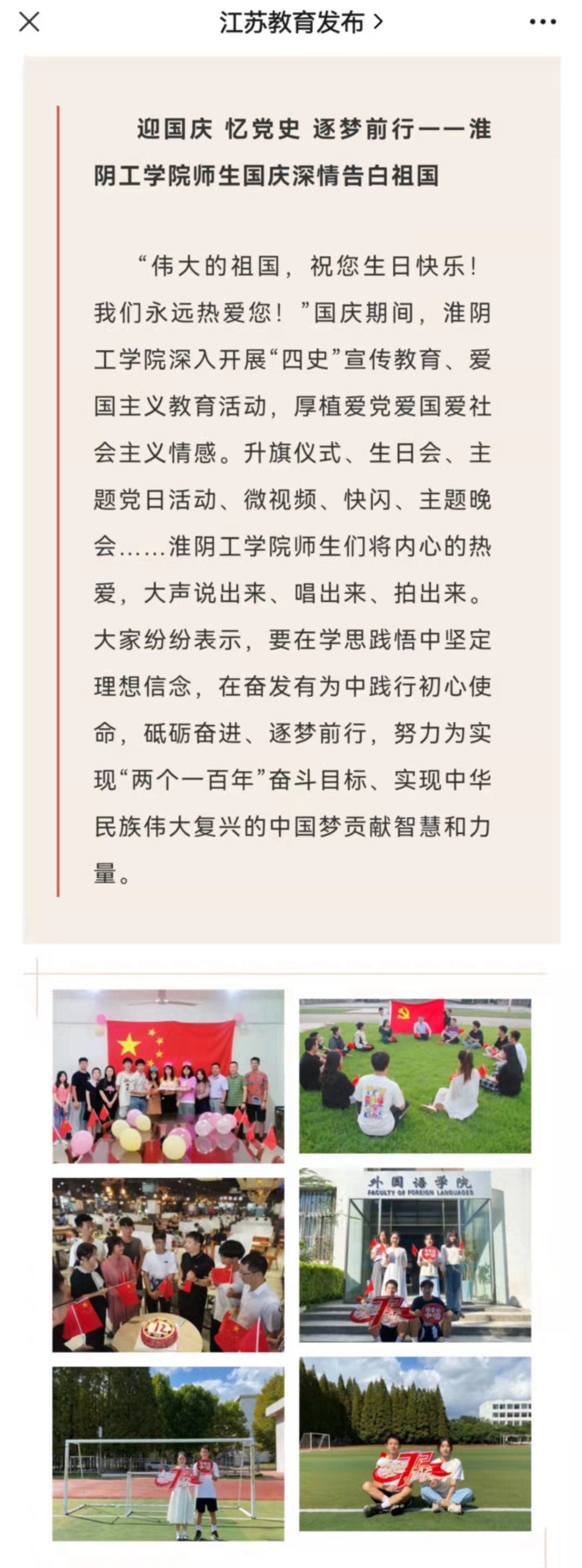 “伟大的祖国,祝您生日快乐!我们永远热爱您!”国庆期间,淮阴工学院深入开展“四史”宣传教育、爱国主义教育活动,厚植爱党爱国爱社会主义情感。升旗仪式、生日会、主题党日活动、微视频、快闪、主题晚会……淮阴工学院师生们将内心的热爱,大声说出来、唱出来、拍出来。大家纷纷表示,要在学思践悟中坚定理想信念,在奋发有为中践行初心使命,砥砺奋进、逐梦前行,努力为实现“两个一百年”奋斗目标、实现中华民族伟大复兴的中国梦贡献智慧和力量。