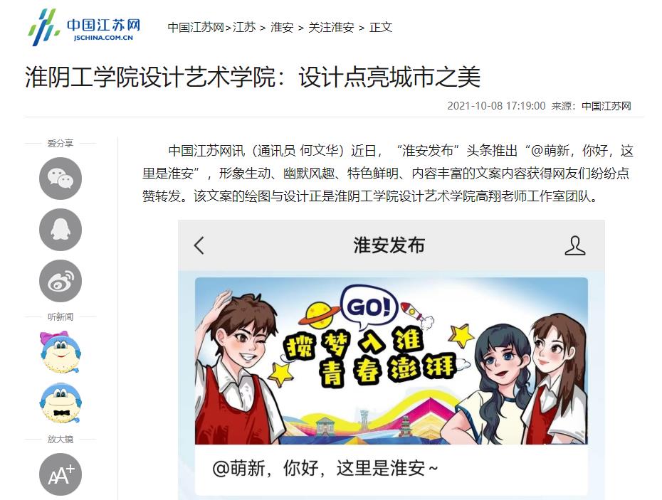 中国江苏网讯(通讯员 何文华)近日,“淮安发布”头条推出“@萌新,你好,这里是淮安”,形象生动、幽默风趣、特色鲜明、内容丰富的文案内容获得网友们纷纷点赞转发。该文案的绘图与设计正是淮阴工学院设计艺术学院高翔老师工作室团队。