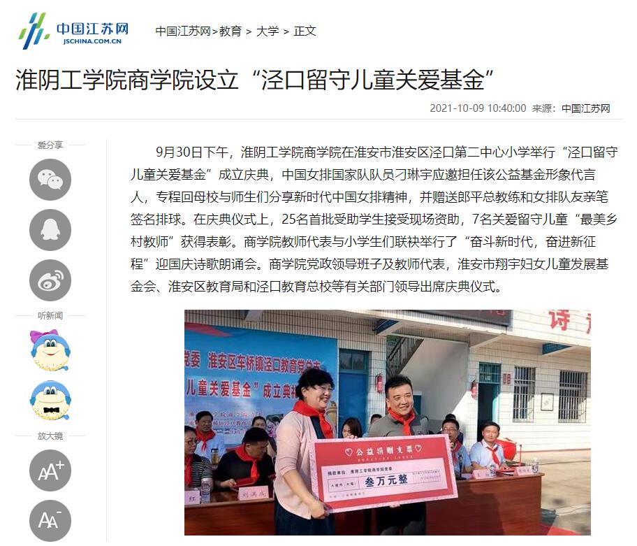 9月30日下午,淮阴工学院商学院在淮安市淮安区泾口第二中心小学举行“泾口留守儿童关爱基金”成立庆典,中国女排国家队队员刁琳宇应邀担任该公益基金形象代言人,专程回母校与师生们分享新时代中国女排精神,并赠送郎平总教练和女排队友亲笔签名排球。在庆典仪式上,25名首批受助学生接受现场资助,7名关爱留守儿童“最美乡村教师”获得表彰。商学院教师代表与小学生们联袂举行了“奋斗新时代,奋进新征程”迎国庆诗歌朗诵会。商学院党政领导班子及教师代表,淮安市翔宇妇女儿童发展基金会、淮安区教育局和泾口教育总校等有关部门领导出席庆典仪式。