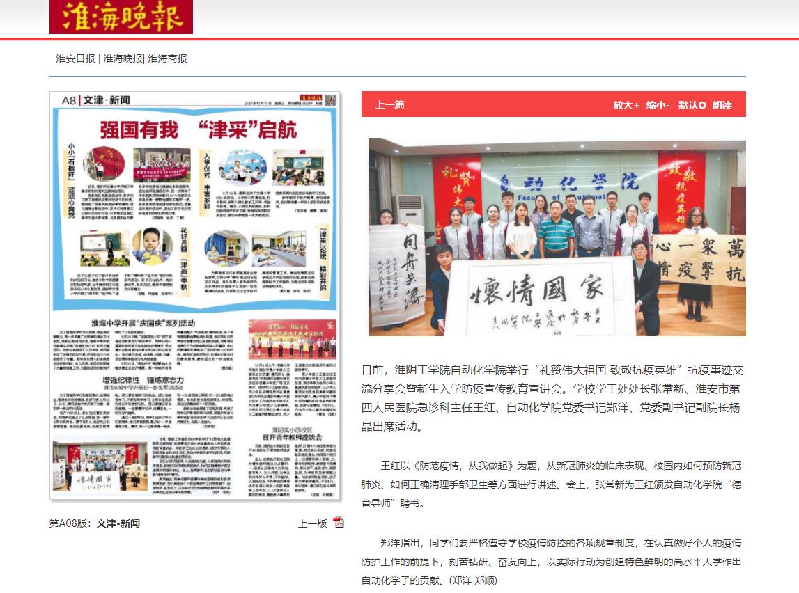 日前,淮阴工学院自动化学院举行“礼赞伟大祖国 致敬抗疫英雄”抗疫事迹交流分享会暨新生入学防疫宣传教育宣讲会。学校学工处处长张常新、淮安市第四人民医院急诊科主任王红、自动化学院党委书记郑洋、党委副书记副院长杨晶出席活动。