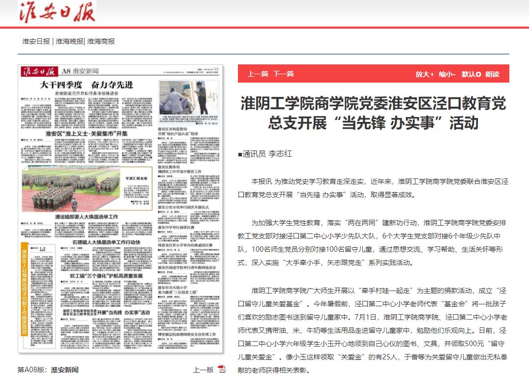 本报讯 为推动党史学习教育走深走实,近年来,淮阴工学院商学院党委联合淮安区泾口教育党总支开展“当先锋 办实事”活动,取得显著成效。