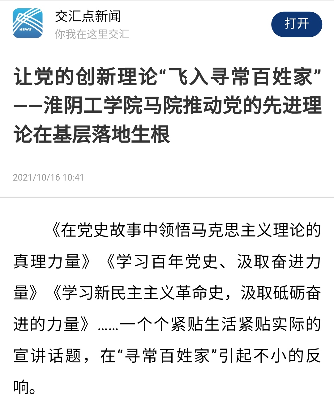 思想是行动的先导,理论是实践的指南。一段时间来,淮阴工学院马克思主义学院党总支在深入抓好理论武装的基础上,紧紧围绕让党的创新理论“飞入寻常百姓家”这一时代课题,积极探索基层理论宣讲新路径,着力打造理论宣讲骨干和队伍,全方位开展理论宣讲活动,推动党的理论创新成果家喻户晓、深入人心,为推动校地高质量发展提供了有力的思想保证和强大的精神力量。
