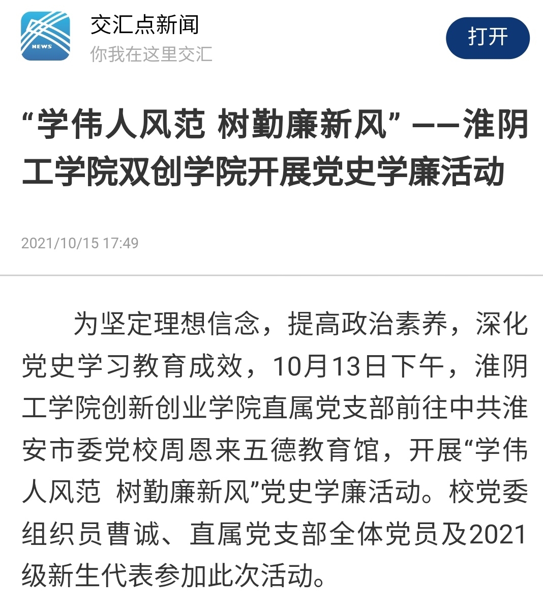为坚定理想信念,提高政治素养,深化党史学习教育成效,10月13日下午,淮阴工学院创新创业学院直属党支部前往中共淮安市委党校周恩来五德教育馆,开展“学伟人风范 树勤廉新风”党史学廉活动。校党委组织员曹诚、直属党支部全体党员及2021级新生代表参加此次活动。