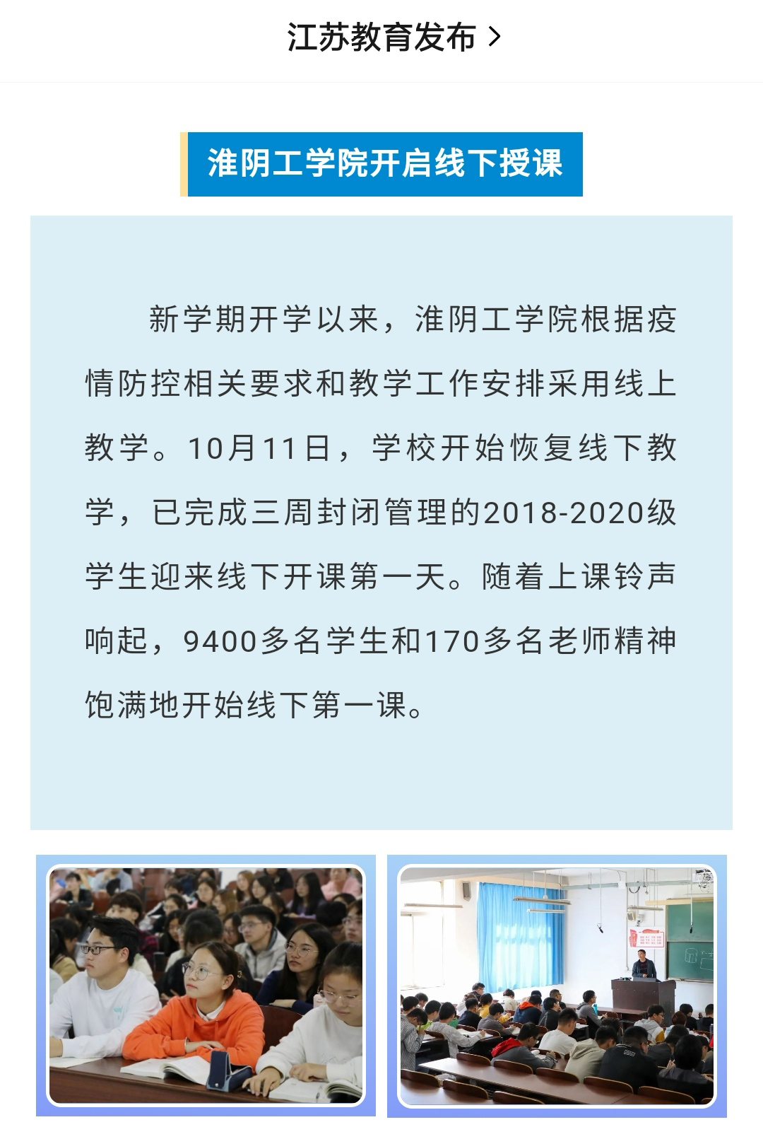 新学期开学以来,淮阴工学院根据疫情防控相关要求和教学工作安排采用线上教学。10月11日,学校开始恢复线下教学,已完成三周封闭管理的2018-2020级学生迎来线下开课第一天。随着上课铃声响起,9400多名学生和170多名老师精神饱满地开始线下第一课。