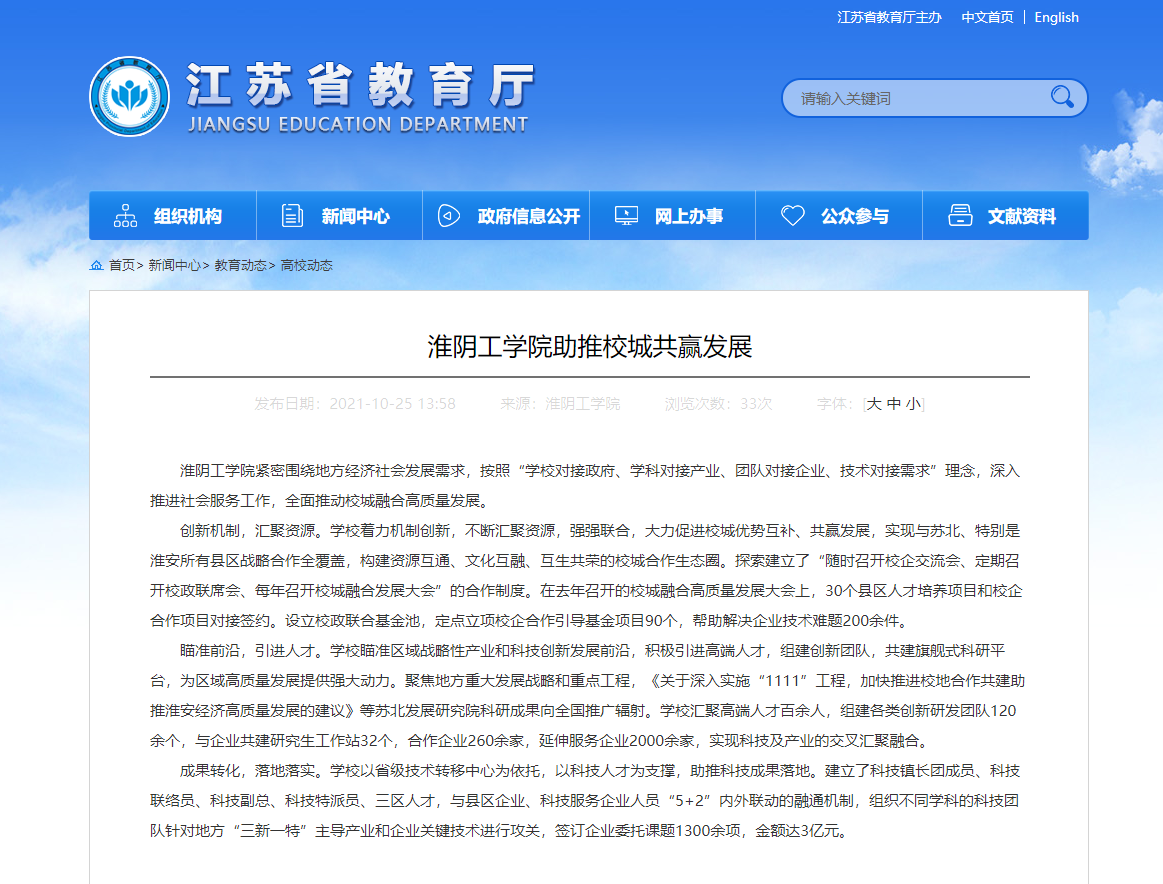 淮阴工学院紧密围绕地方经济社会发展需求,按照“学校对接政府、学科对接产业、团队对接企业、技术对接需求”理念,深入推进社会服务工作,全面推动校城融合高质量发展。