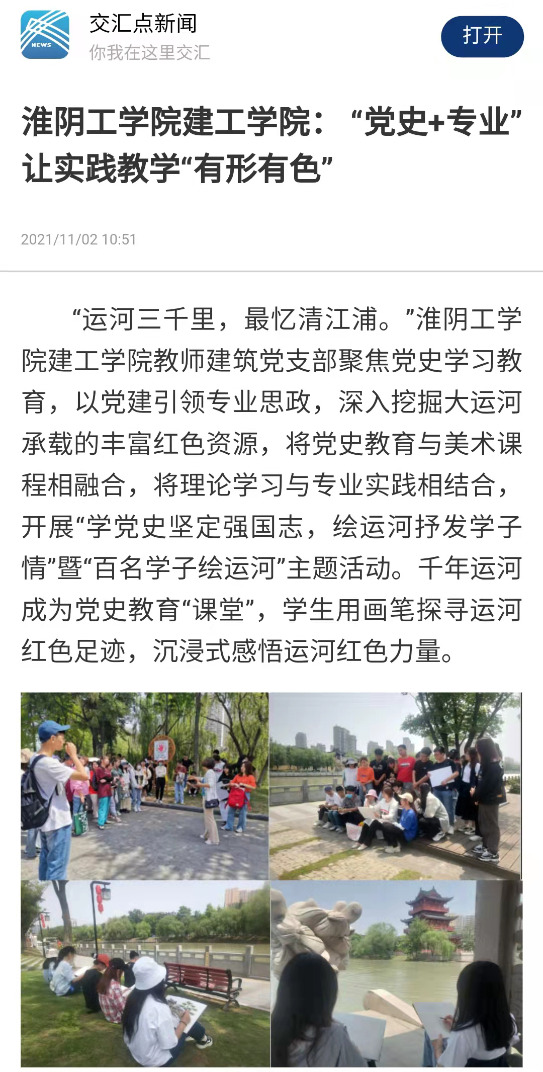 “运河三千里,最忆清江浦。”淮阴工学院建工学院教师建筑党支部聚焦党史学习教育,以党建引领专业思政,深入挖掘大运河承载的丰富红色资源,将党史教育与美术课程相融合,将理论学习与专业实践相结合,开展“学党史坚定强国志,绘运河抒发学子情”暨“百名学子绘运河”主题活动。千年运河成为党史教育“课堂”,学生用画笔探寻运河红色足迹,沉浸式感悟运河红色力量。