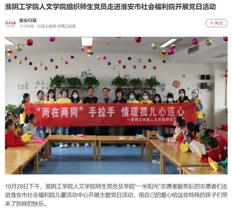 10月29日下午,淮阴工学院人文学院师生党员及学院“一米阳光”志愿者服务队的志愿者们走进淮安市社会福利院儿童活动中心开展主题党日活动,用自己的爱心给这些特殊的孩子们带来了别样的快乐。