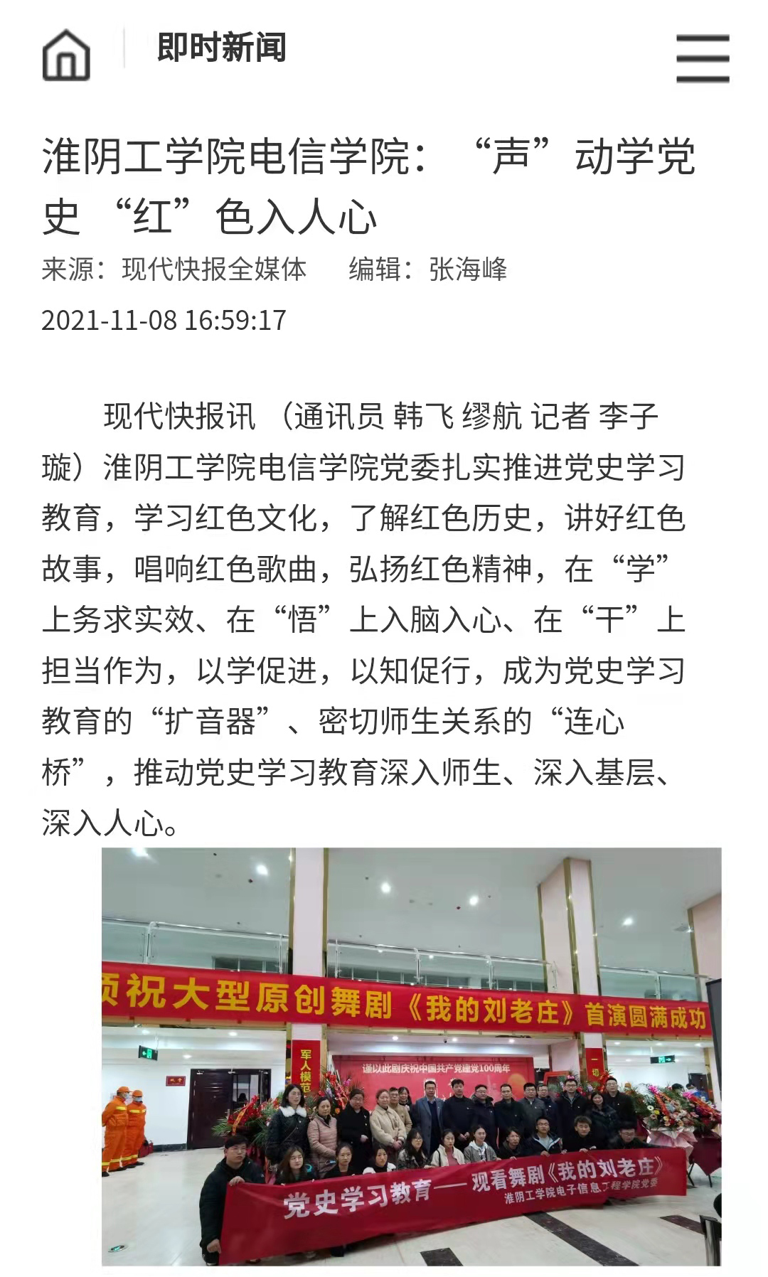 电信学院党委坚持将爱党爱国爱社会主义情怀深刻融入党员教育培养中,挖掘好、利用好周恩来精神、刘老庄精神等当地红色资源,从理论小课堂到情景大课堂,让党史教育走进红色纪念地、演出场馆、电影院和大剧院,上好一节节“行走的思政课”,在党史的沉浸式学习中汲取力量,让党史学习教育接地气、增活力、有实效。
