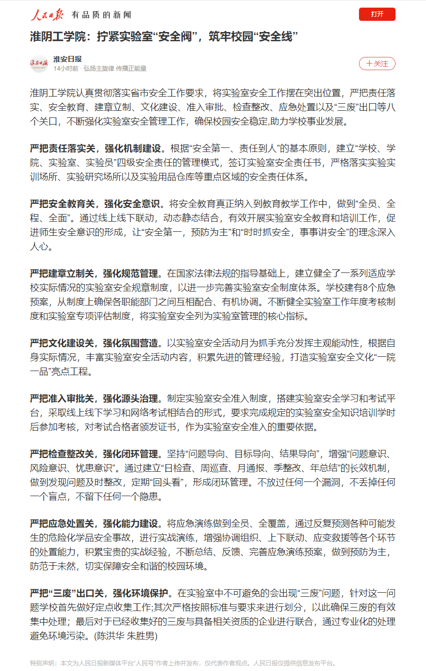 淮阴工学院认真贯彻落实省市安全工作要求,将实验室安全工作摆在突出位置,严把责任落实、安全教育、建章立制、文化建设、准入审批、检查整改、应急处置以及“三废”出口等八个关口,不断强化实验室安全管理工作,确保校园安全稳定,助力学校事业发展。