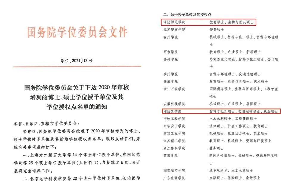 日前,国务院学位委员会发布《关于下达2020年审核增列的博士、硕士学位授予单位及其学位授权点名单的通知》淮安两所高校,获批硕士学位授予单位。