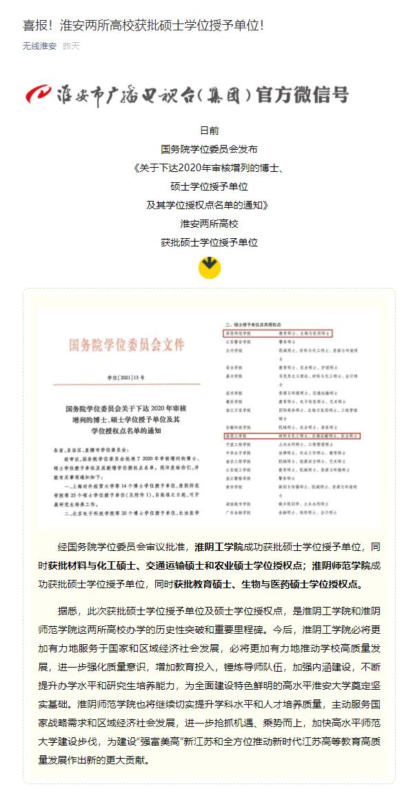 经国务院学位委员会审议批准,淮阴工学院成功获批硕士学位授予单位,同时获批材料与化工硕士、交通运输硕士和农业硕士学位授权点;淮阴师范学院成功获批硕士学位授予单位,同时获批教育硕士、生物与医药硕士学位授权点。