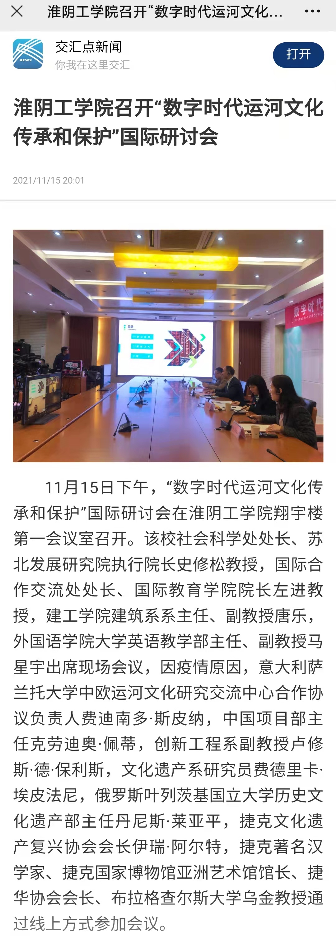 11月15日下午,“数字时代运河文化传承和保护”国际研讨会在淮阴工学院翔宇楼第一会议室召开。该校社会科学处处长、苏北发展研究院执行院长史修松教授,国际合作交流处处长、国际教育学院院长左进教授,建工学院建筑系系主任、副教授唐乐,外国语学院大学英语教学部主任、副教授马星宇出席现场会议,因疫情原因,意大利萨兰托大学中欧运河文化研究交流中心合作协议负责人费迪南多·斯皮纳,中国项目部主任克劳迪奥·佩蒂,创新工程系副教授卢修斯·德·保利斯,文化遗产系研究员费德里卡·埃皮法尼,俄罗斯叶列茨基国立大学历史文化遗产部主任丹尼斯·莱亚平,捷克文化遗产复兴协会会长伊瑞·阿尔特,捷克著名汉学家、捷克国家博物馆亚洲艺术馆馆长、捷华协会会长、布拉格查尔斯大学乌金教授通过线上方式参加会议。