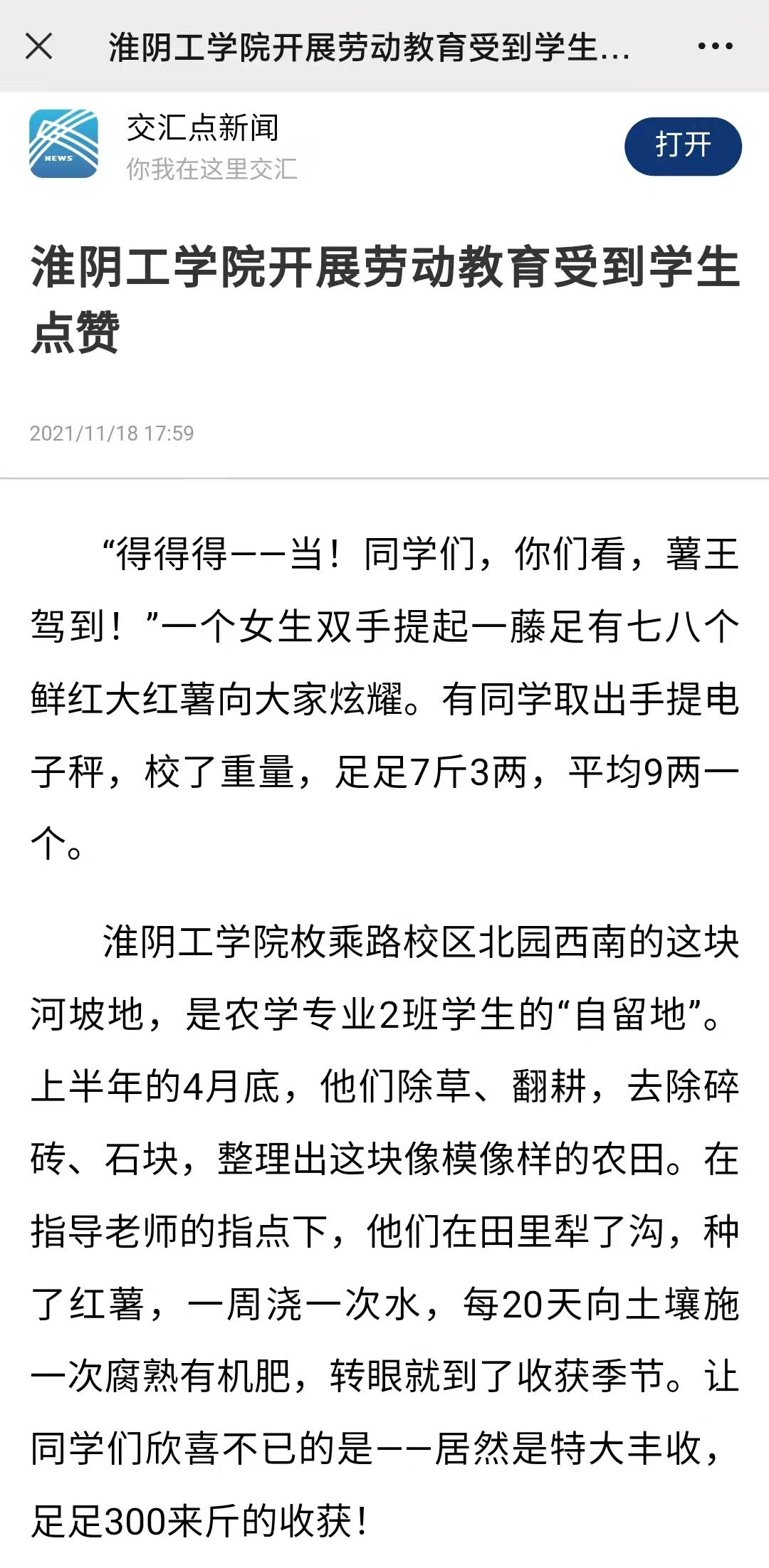 淮阴工学院枚乘路校区北园西南的这块河坡地,是农学专业2班学生的“自留地”。上半年的4月底,他们除草、翻耕,去除碎砖、石块,整理出这块像模像样的农田。在指导老师的指点下,他们在田里犁了沟,种了红薯,一周浇一次水,每20天向土壤施一次腐熟有机肥,转眼就到了收获季节。让同学们欣喜不已的是——居然是特大丰收,足足300来斤的收获!