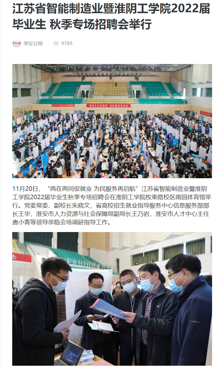11月20日,“两在两同促就业 为民服务再启航”江苏省智能制造业暨淮阴工学院2022届毕业生秋季专场招聘会在淮阴工学院枚乘路校区南园体育馆举行。党委常委、副校长朱晓文,省高校招生就业指导服务中心信息服务部部长王华,淮安市人力资源与社会保障局副局长王乃岩,淮安市人才中心主任唐小青等领导亲临会场调研指导工作。