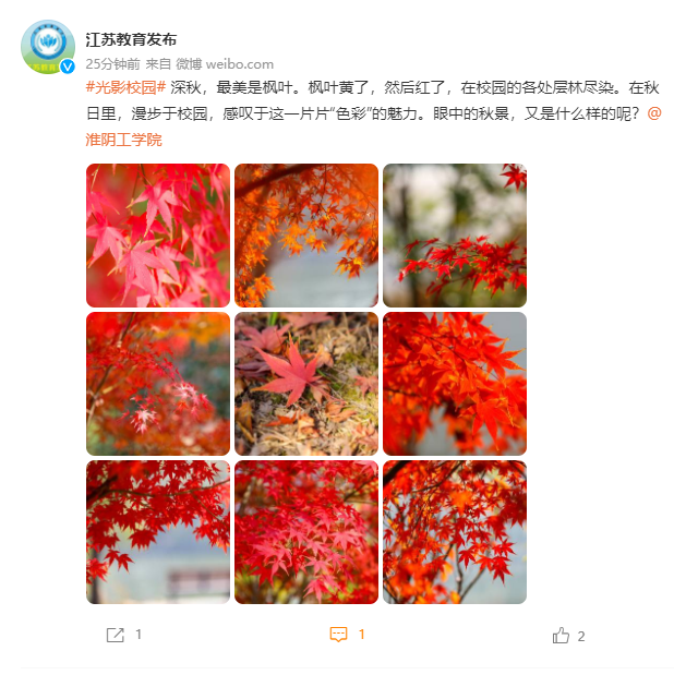 深秋,最美是枫叶。枫叶黄了,然后红了,在校园的各处层林尽染。在秋日里,漫步于校园,感叹于这一片片“色彩”的魅力。眼中的秋景,又是什么样的呢?