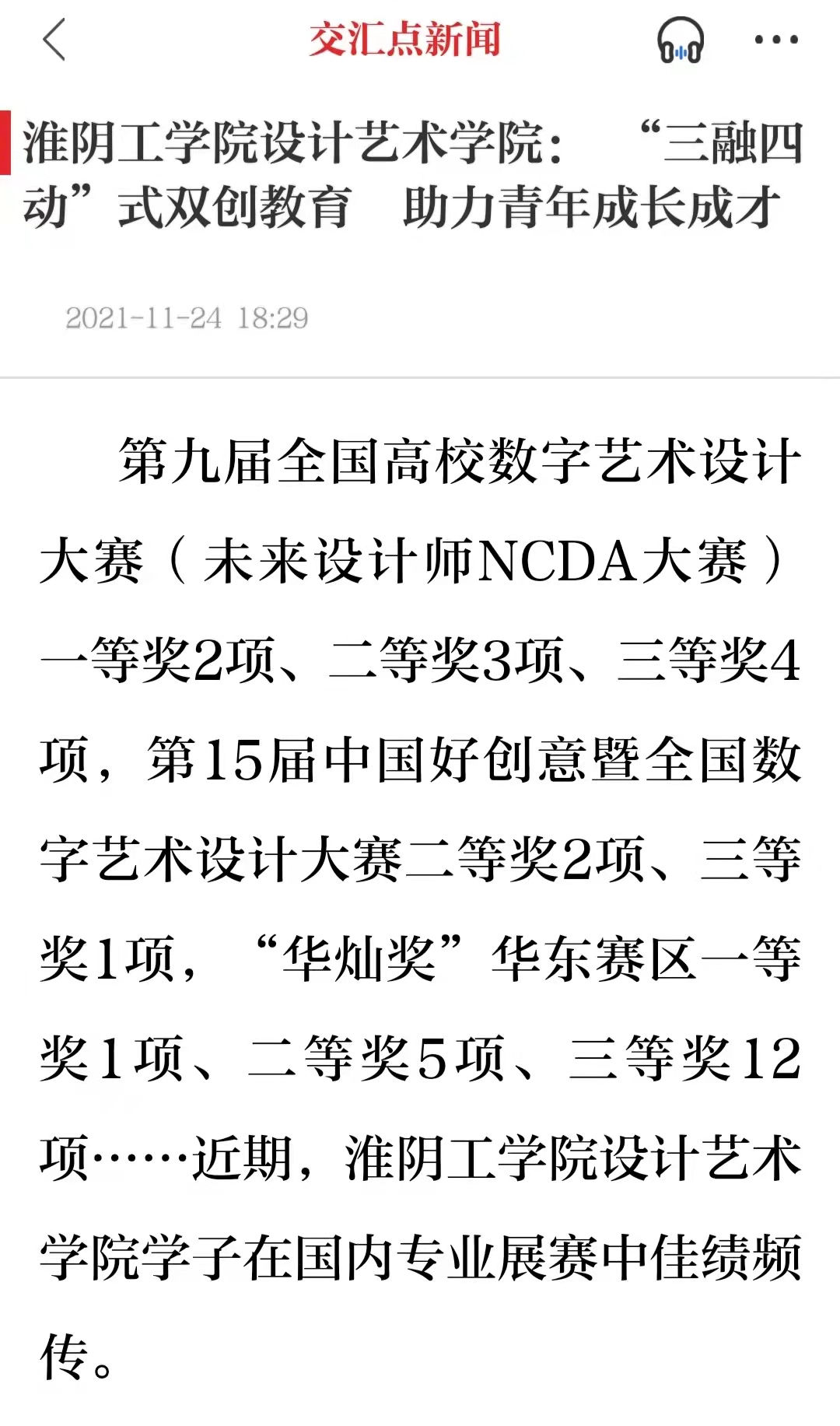 第九届全国高校数字艺术设计大赛(未来设计师NCDA大赛)一等奖2项、二等奖3项、三等奖4项,第15届中国好创意暨全国数字艺术设计大赛二等奖2项、三等奖1项,“华灿奖”华东赛区一等奖1项、二等奖5项、三等奖12项……近期,淮阴工学院设计艺术学院学子在国内专业展赛中佳绩频传。