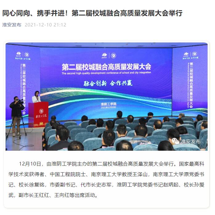 12月10日,由淮阴工学院主办的第二届校城融合高质量发展大会举行。国家最高科学技术奖获得者、中国工程院院士、南京理工大学教授王泽山,南京理工大学原党委书记、校长徐复铭,市委副书记、代市长史志军,淮阴工学院党委书记赵炳起、校长孙爱武,副市长王红红、王向红等出席活动。