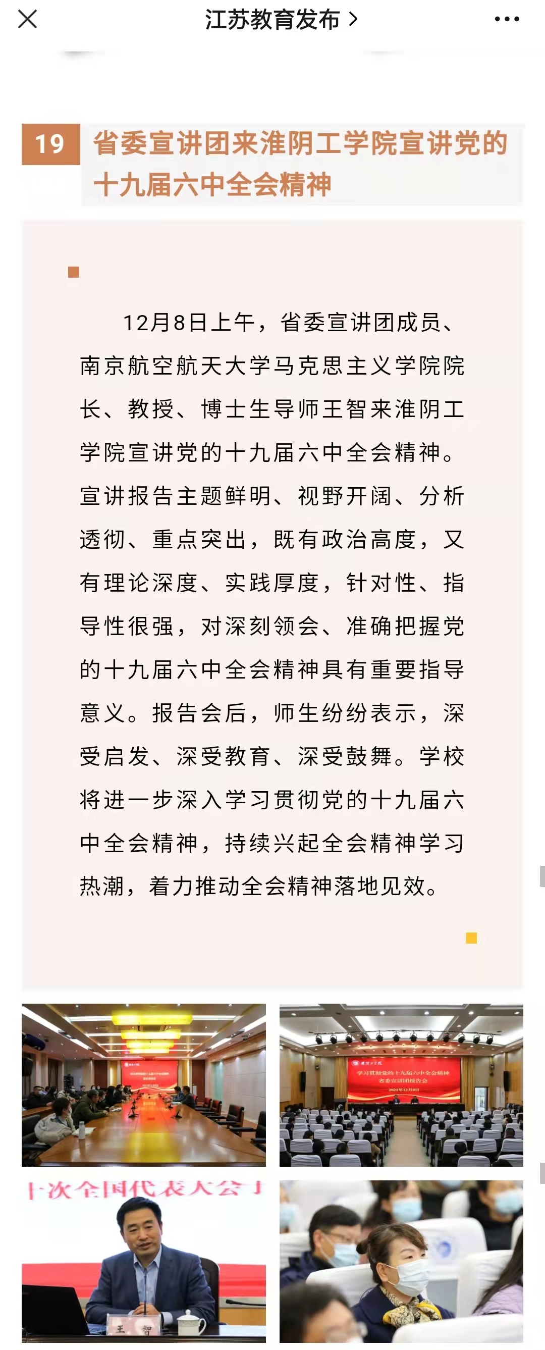 12月8日上午,省委宣讲团成员、南京航空航天大学马克思主义学院院长、教授、博士生导师王智来淮阴工学院宣讲党的十九届六中全会精神。宣讲报告主题鲜明、视野开阔、分析透彻、重点突出,既有政治高度,又有理论深度、实践厚度,针对性、指导性很强,对深刻领会、准确把握党的十九届六中全会精神具有重要指导意义。报告会后,师生纷纷表示,深受启发、深受教育、深受鼓舞。学校将进一步深入学习贯彻党的十九届六中全会精神,持续兴起全会精神学习热潮,着力推动全会精神落地见效。