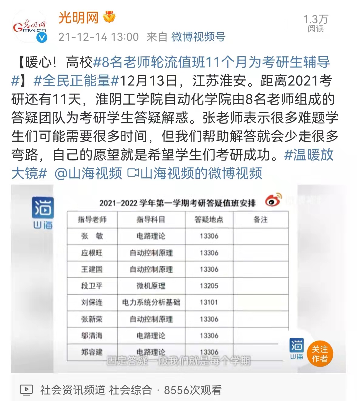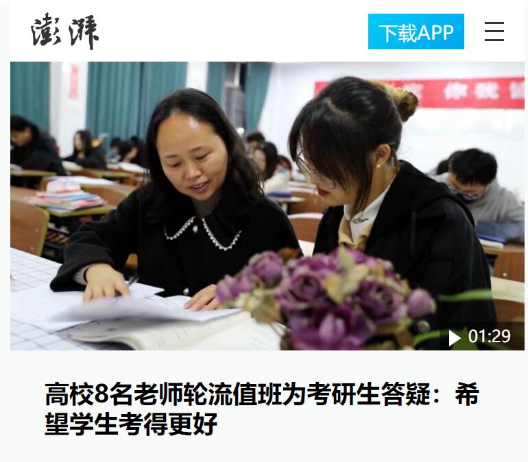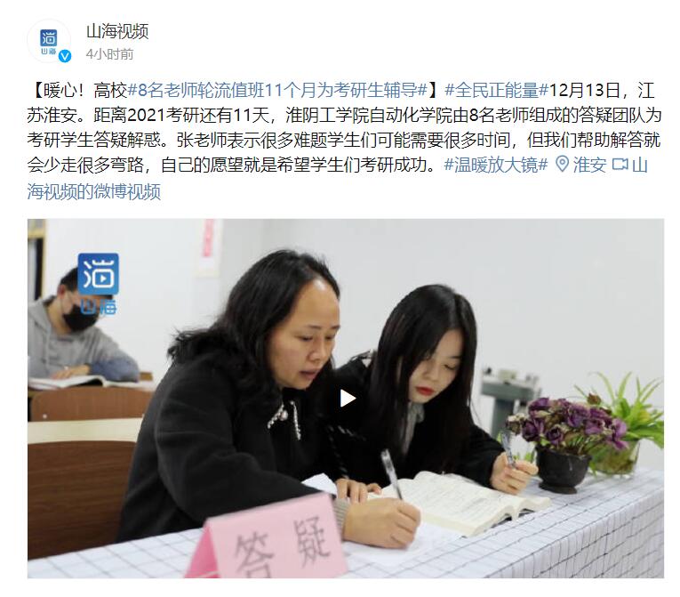 暖心!高校8名老师轮流值班11个月为考研生辅导。近日,我校自动化学院8名老师组成的答疑团队,连续11个月为考研学生答疑解惑的暖心举动受到媒体关注。张老师表示很多难题学生们可能需要很多时间,但我们帮助解答就会少走很多弯路,自己的愿望就是希望学生们考研成功!
