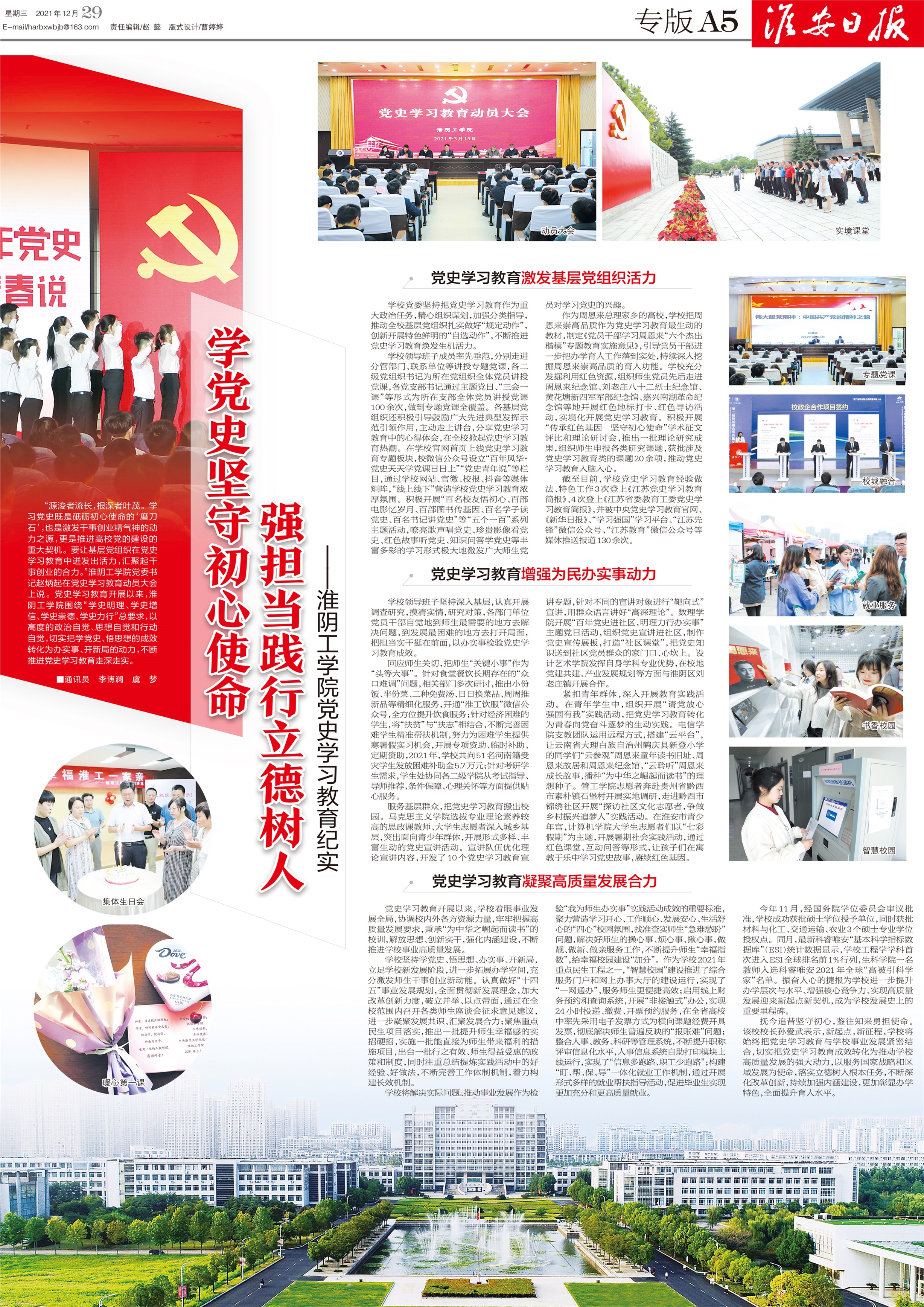“源浚者流长,根深者叶茂。学习党史既是砥砺初心使命的‘磨刀石’,也是激发干事创业精气神的动力之源,更是推进高校党的建设的重大契机。要让基层党组织在党史学习教育中迸发出活力,汇聚起干事创业的合力。”淮阴工学院党委书记赵炳起在党史学习教育动员大会上说。党史学习教育开展以来,淮阴工学院围绕“学史明理、学史增信、学史崇德、学史力行”总要求,以高度的政治自觉、思想自觉和行动自觉,切实把学党史、悟思想的成效转化为办实事、开新局的动力,不断推进党史学习教育走深走实。