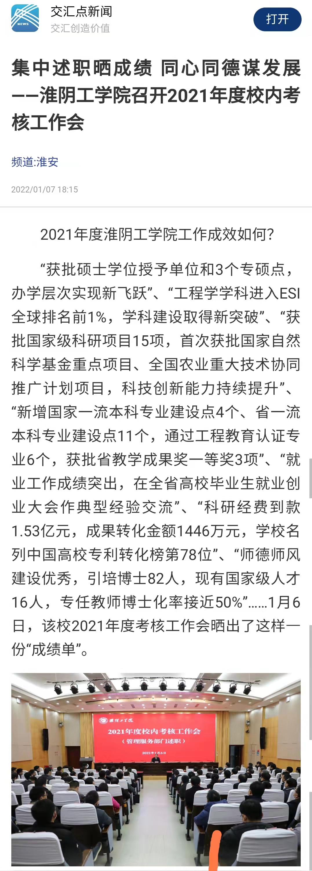 “获批硕士学位授予单位和3个专硕点,办学层次实现新飞跃”、“工程学学科进入ESI全球排名前1%,学科建设取得新突破”、“获批国家级科研项目15项,首次获批国家自然科学基金重点项目、全国农业重大技术协同推广计划项目,科技创新能力持续提升”、“新增国家一流本科专业建设点4个、省一流本科专业建设点11个,通过工程教育认证专业6个,获批省教学成果奖一等奖3项”、“就业工作成绩突出,在全省高校毕业生就业创业大会作典型经验交流”、“科研经费到款1.53亿元,成果转化金额1446万元,学校名列中国高校专利转化榜第78位”、“师德师风建设优秀,引培博士82人,现有国家级人才16人,专任教师博士化率接近50%”……1月6日,该校2021年度考核工作会晒出了这样一份“成绩单”。