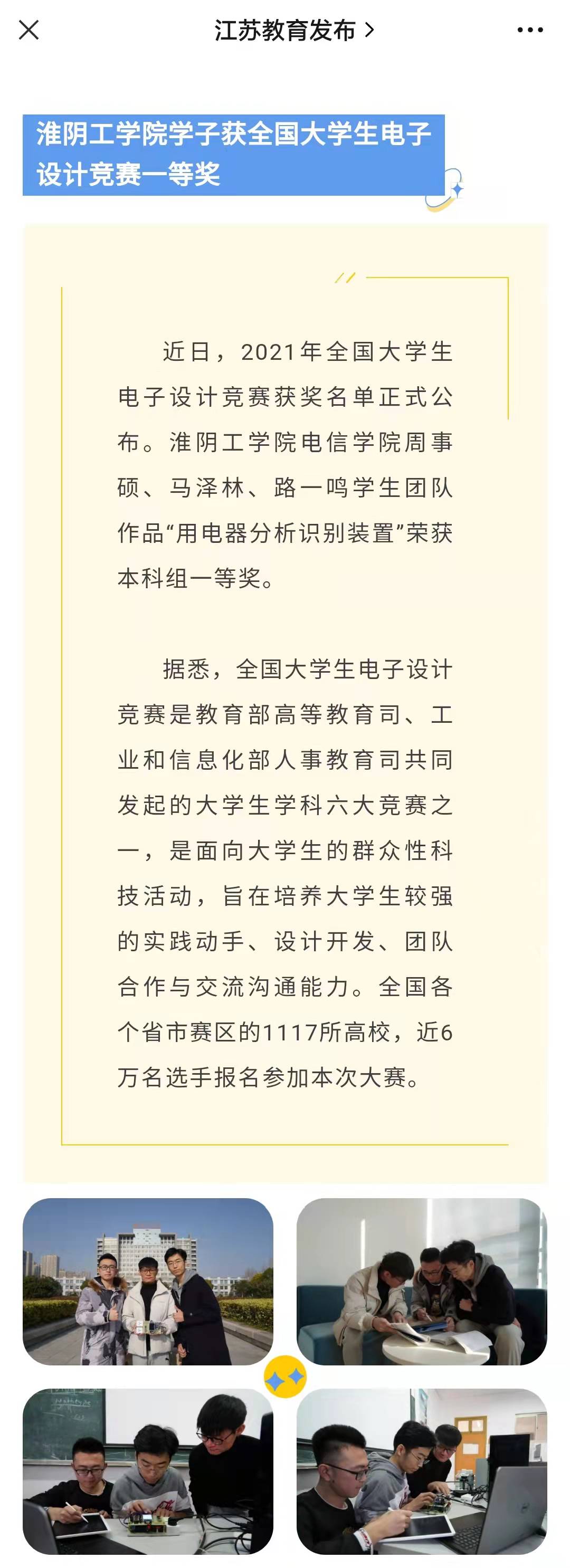 近日,2021年全国大学生电子设计竞赛获奖名单正式公布。淮阴工学院电信学院周事硕、马泽林、路一鸣学生团队作品“用电器分析识别装置”荣获本科组一等奖。