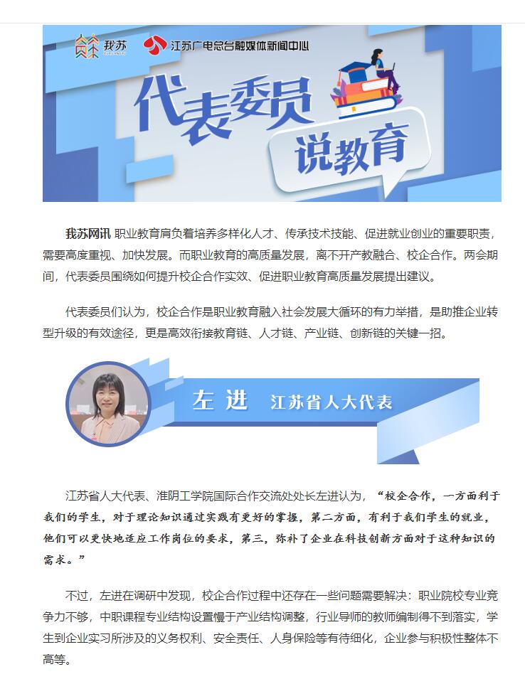 江苏省人大代表、淮阴工学院国际合作交流处处长左进认为,“校企合作,一方面利于我们的学生,对于理论知识通过实践有更好的掌握,第二方面,有利于我们学生的就业,他们可以更快地适应工作岗位的要求,第三,弥补了企业在科技创新方面对于这种知识的需求。”