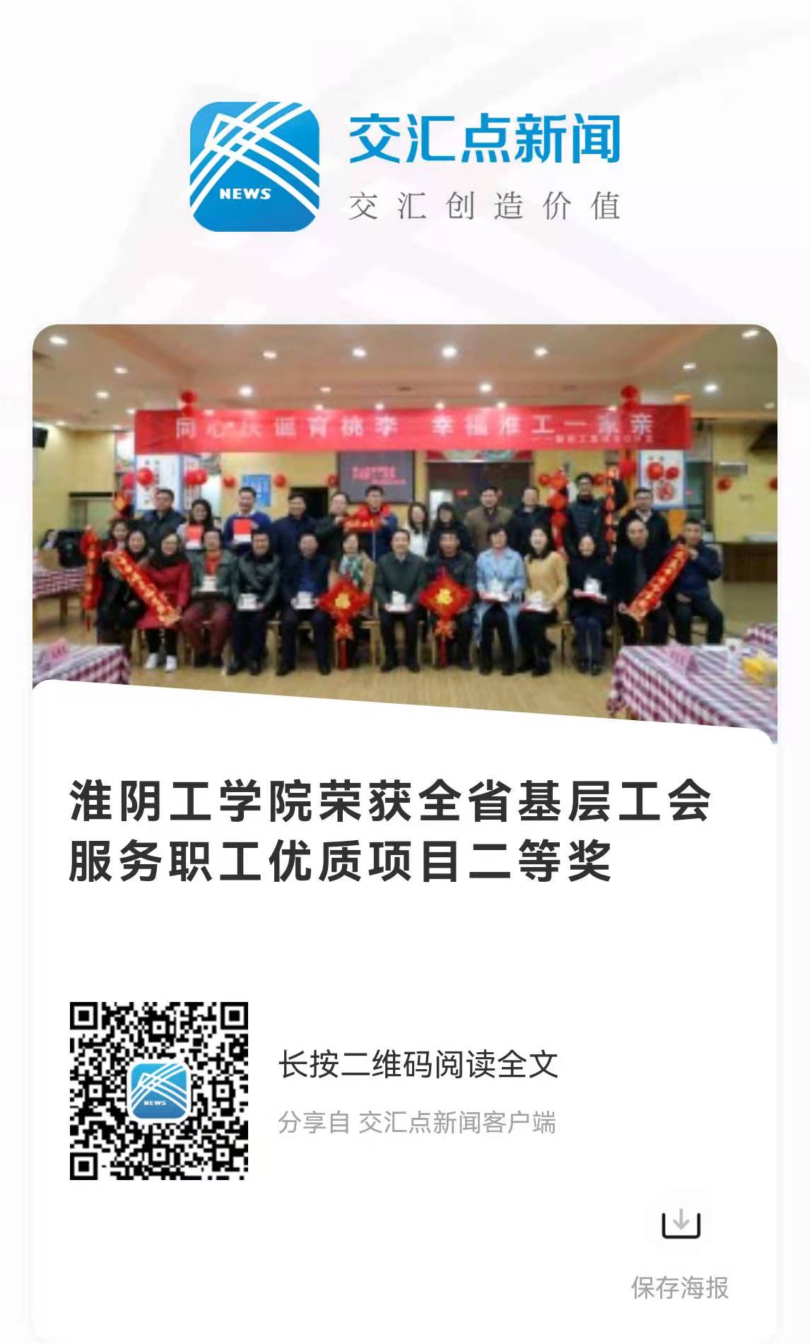 近日,江苏省总工会发布《关于命名2021年度全省基层工会服务职工优质项目的通报》(苏工办〔2021〕70号),淮阴工学院“同心庆诞育桃李 幸福淮工一家亲”集体生日沙龙项目荣获全省基层工会服务职工优质项目二等奖。