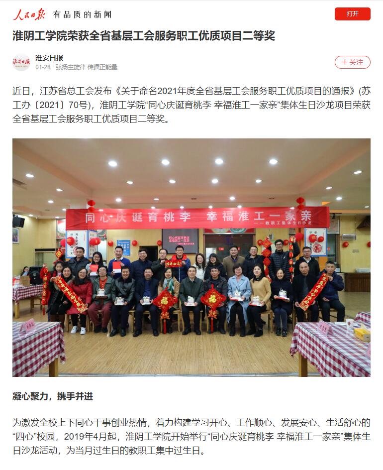 近日,江苏省总工会发布《关于命名2021年度全省基层工会服务职工优质项目的通报》(苏工办〔2021〕70号),淮阴工学院“同心庆诞育桃李 幸福淮工一家亲”集体生日沙龙项目荣获全省基层工会服务职工优质项目二等奖。