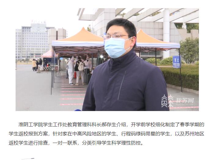 淮阴工学院学生工作处教育管理科科长郝存生介绍,开学前学校细化制定了春季学期的学生返校报到方案,针对家在中高风险地区的学生、行程码绿码带星的学生,以及苏州地区返校学生进行排查,一对一联系,分类引导学生科学理性防控。