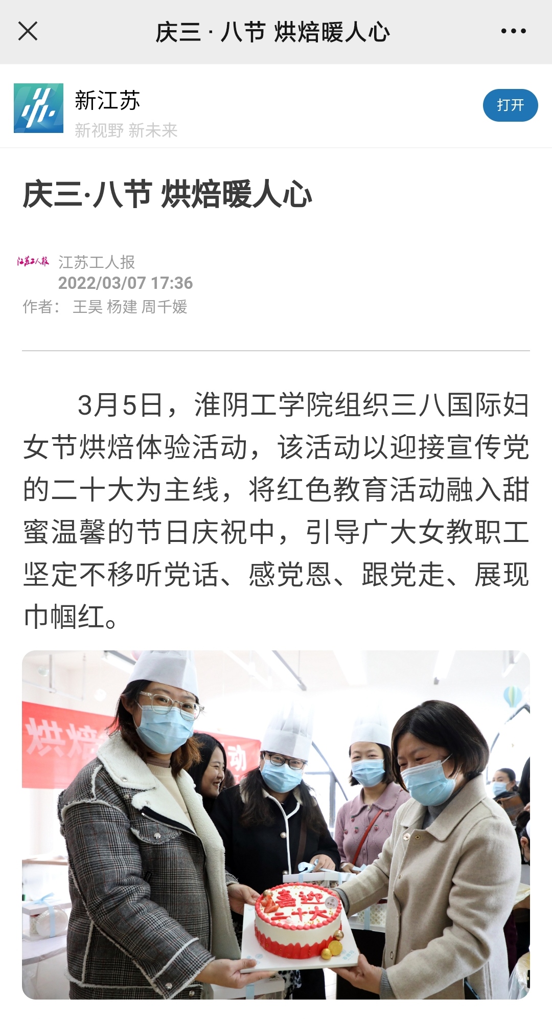 3月5日,淮阴工学院组织三八国际妇女节烘焙体验活动,该活动以迎接宣传党的二十大为主线,将红色教育活动融入甜蜜温馨的节日庆祝中,引导广大女教职工坚定不移听党话、感党恩、跟党走、展现巾帼红。