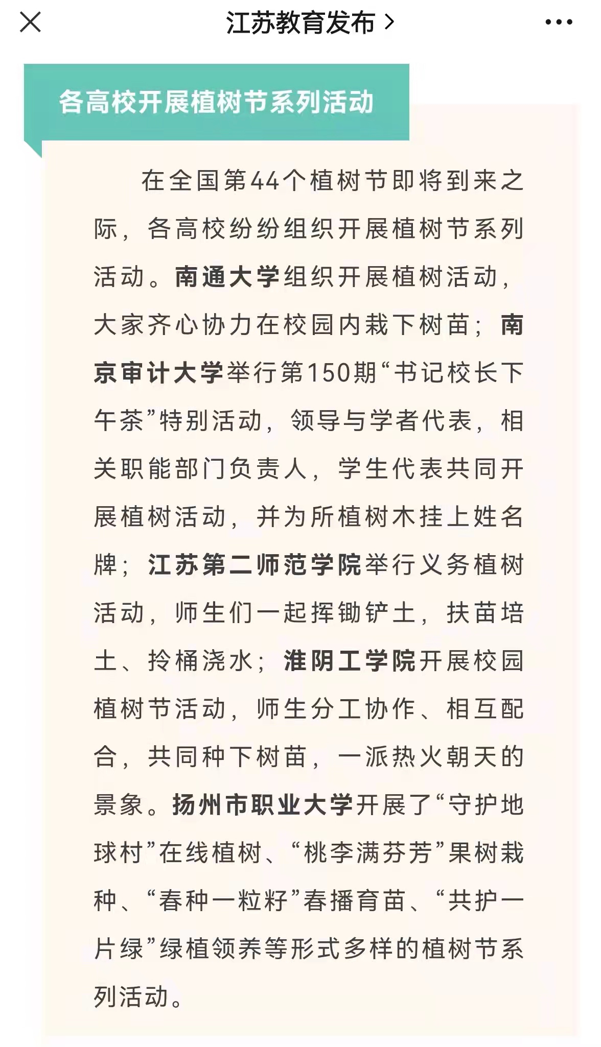 在全国第44个植树节即将到来之际,各高校纷纷组织开展植树节系列活动。南通大学组织开展植树活动,大家齐心协力在校园内栽下树苗;南京审计大学举行第150期“书记校长下午茶”特别活动,领导与学者代表,相关职能部门负责人,学生代表共同开展植树活动,并为所植树木挂上姓名牌;江苏第二师范学院举行义务植树活动,师生们一起挥锄铲土,扶苗培土、拎桶浇水;淮阴工学院开展校园植树节活动,师生分工协作、相互配合,共同种下树苗,一派热火朝天的景象。扬州市职业大学开展了“守护地球村”在线植树、“桃李满芬芳”果树栽种、“春种一粒籽”春播育苗、“共护一片绿”绿植领养等形式多样的植树节系列活动。