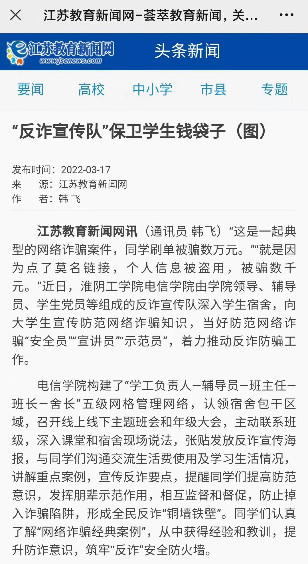 “这是一起典型的网络诈骗案件,同学刷单被骗数万元。”“就是因为点了莫名链接,个人信息被盗用,被骗数千元。”近日,淮阴工学院电信学院由学院领导、辅导员、学生党员等组成的反诈宣传队深入学生宿舍,向大学生宣传防范网络诈骗知识,当好防范网络诈骗“安全员”“宣讲员”“示范员”,着力推动反诈防骗工作。