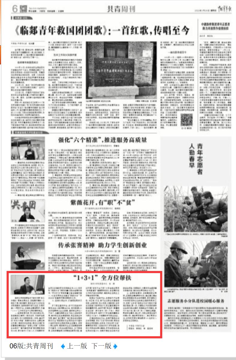 2022年3月24日出版的《中国青年报》以《“1+3+1”全方位帮扶》为题,报道了淮阴工学院团委坚守“服务尽责”的工作理念,聚焦主责主业,紧贴青年需求,以服务大局、服务青年、服务社会为工作出发点和落脚点,坚持思想引领为主线,协同打造3个帮扶平台,实施就业精准帮扶,构建“1+3+1”工作体系全方位帮扶青年就业。
